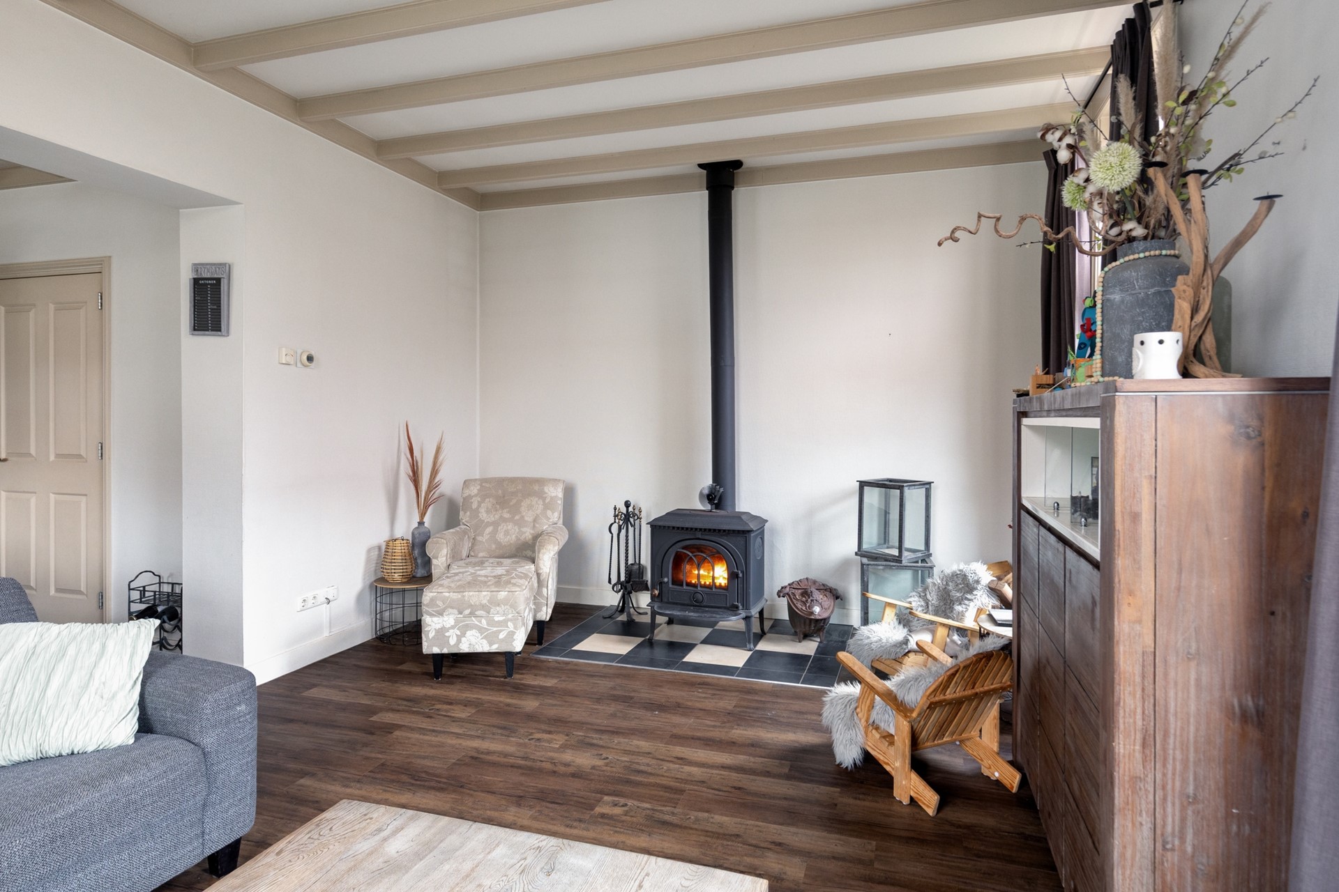 Begane grond: entree, hal, meterkast, toiletruimte met hangend closet en fonteintje. Ruime lichte werkkamer/kantoor met gaskachel. Woonkamer met rookkanaal en houtkachel. Open keuken in landelijke stijl met inbouwapparatuur waaronder oven met 6 pits gas kookplaat, koel-vries combinatie, vaatwasser en afzuigkap. Berging/Bijkeuken. Vanuit de keuken is er direct toegang tot de aangebouwde veranda. De veranda geeft naast een prettige overdekte entree tevens een heerlijk droog terras.
