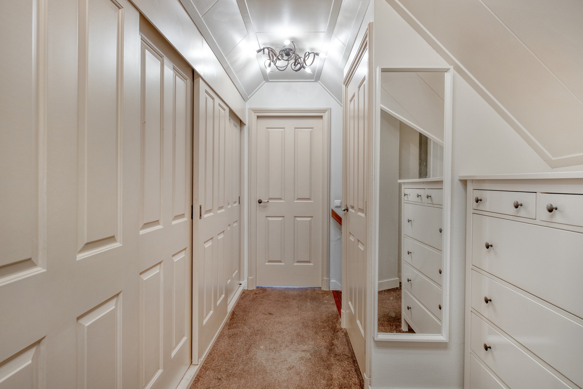1e Verdieping: overloop met vaste kast waarin de CV-opstelling is gesitueerd. Vaste kastenwand met bergruimte en aansluitmogelijkheid voor wassen en drogen. Lichte ouder-slaapkamer met 5 dakramen. Badkamer met ligbad, inloopdouche, wastafel, toilet en vloerverwarming. 2 (kinder)slaapkamers.