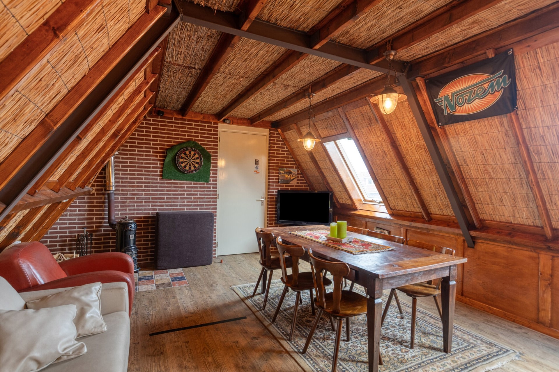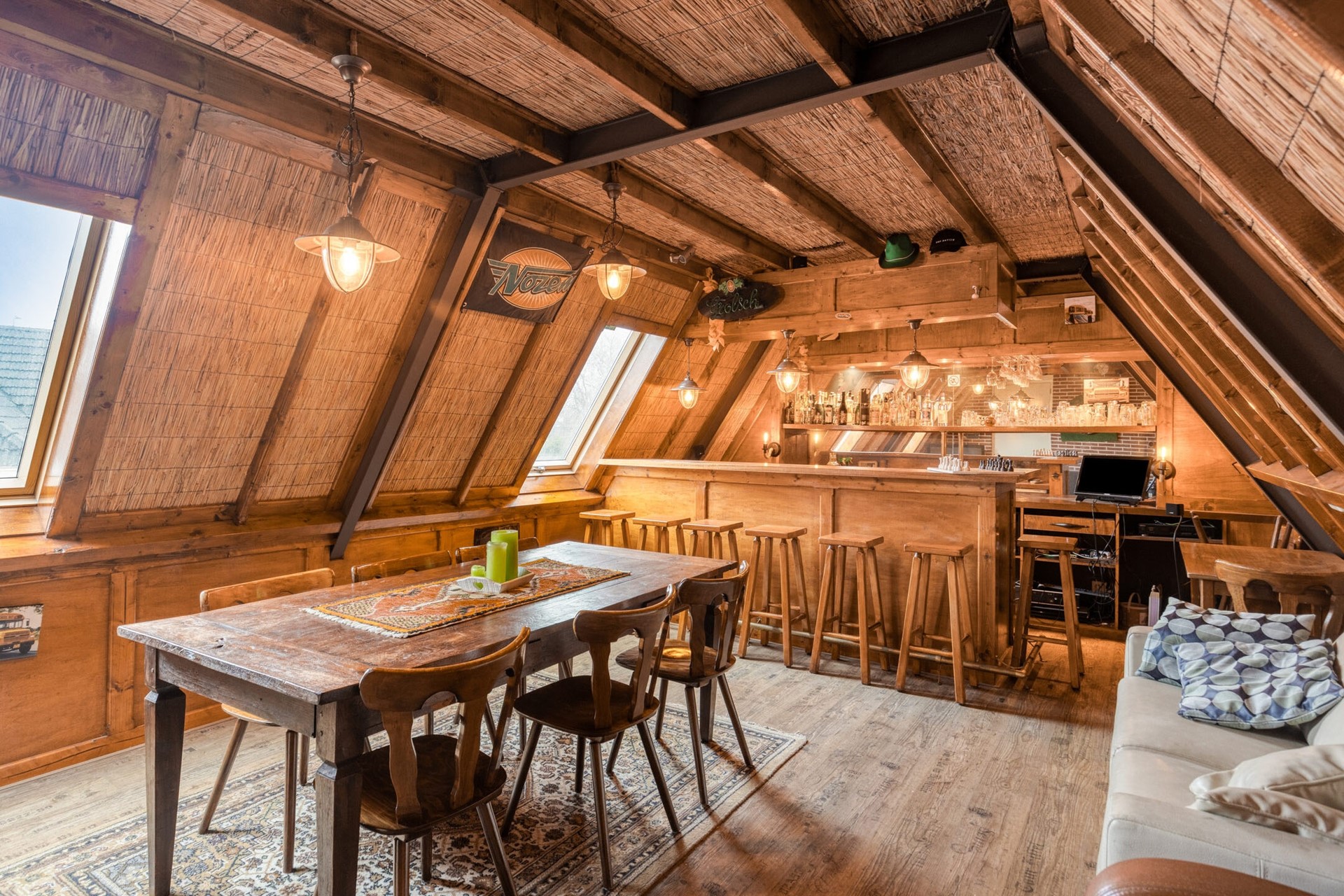 Sfeervol ingerichte bar-ruimte met houtkachel en houten bar met spiegelwand.